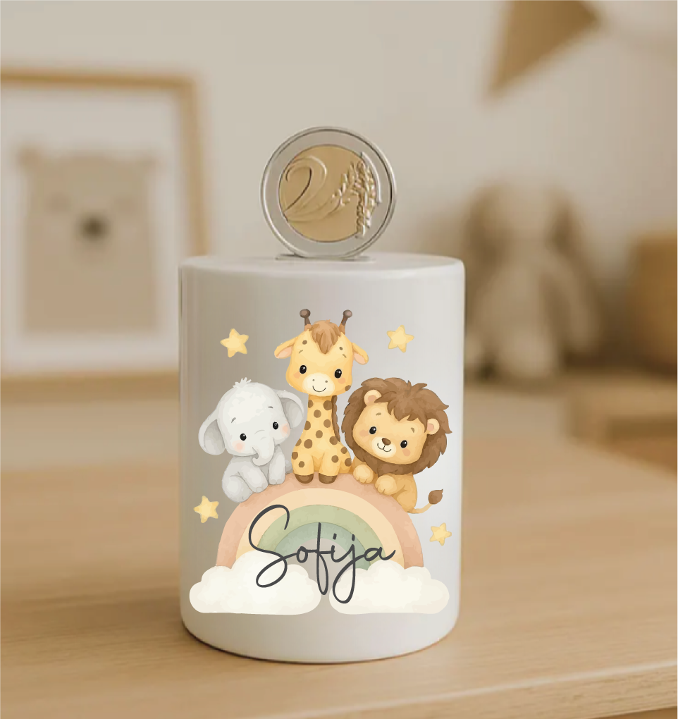 Z našimi prikupnimi hranilniki bo varčevanje postalo prava pustolovščina. Vsak hranilnik je okrašen z ljubkimi motivi in imenom otroka, zato je popolnoma unikaten.