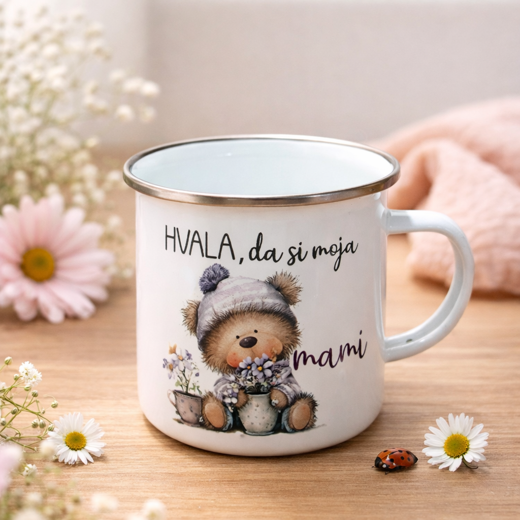 Nežna in čudovito oblikovana emajlirana skodelica z napisom “HVALA, da si moja mami, mama, prijateljica…” je popolno darilo za osebo, ki si zasluži nekaj posebnega. Prikupen motiv medvedka s cvetjem ustvari topel, ljubeč občutek in takoj pričara nasmeh.
